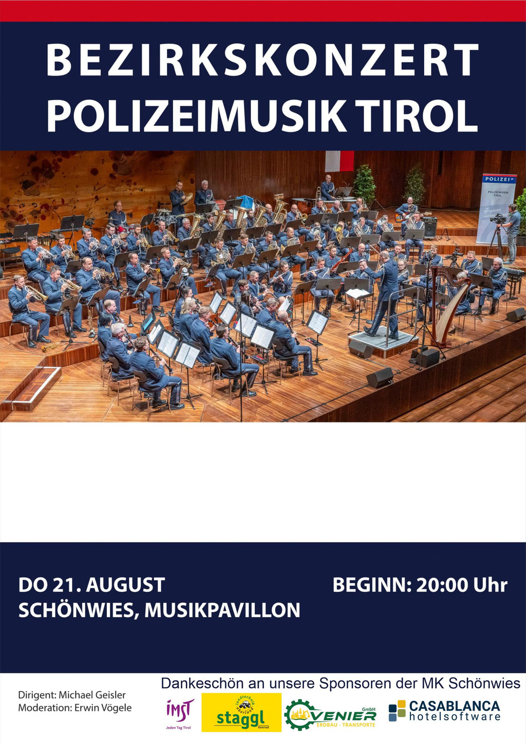 Unter der musikalischen Leitung von Kapellmeister Michael Geisler begeisterte die Polizeimusik Tirol das Publikum mit einem abwechslungsreichen und schwungvollen Programm. Von traditionellen Märschen bis hin zu modernen Arrangements war für jeden Musikgeschmack etwas dabei.